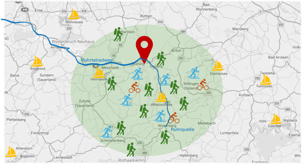 Mit Blick auf den Stüppelturm, das Riesenrad vom FORT FUN Abenteuerland und die direkt vor der Tür beginnenden Wanderwege lassen die actionreichen Abenteuer in der Natur nicht lange auf sich warten. Ob Wandern, Skigebiete oder Bikeparks rund um Winterberg, Willingen oder Ausflüge an die Bruchhauser Steine, einer Alpaka Ranch, dem Skywalk & Skisprungschanze, der Hennesee, Sorpesee oder Wasserski am Hillebachsee- es ist für jede Saison was dabei.